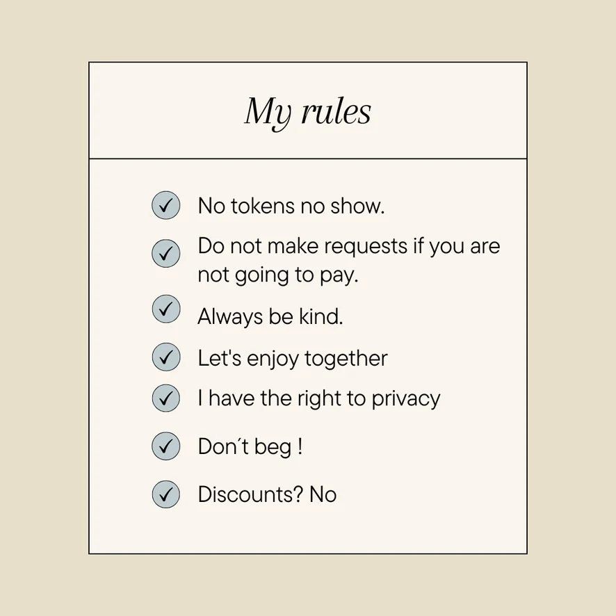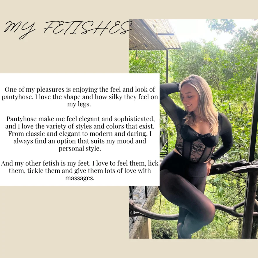 Plieskanie po zadku, Erotický tanec, Zárez, Dildo alebo vibrátor, Striptíz, Foot fetiš, Análne hračky, Nylon, Podpätky, V kancelárii, Masturbácia, Ponižovanie, Prstovanie, Sprosté reči, Sexuálne hračky, Latex, Orgazmus, Hardcore, Twerk, Honenie, Roleplay, Medzi kozy, Pokyny na honenie, Dusenie, Orál